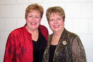 Here's a photo of my dear friend, Connie Miller, and me in our Christmas show garb and make-up. False eyelashes, bright red lipstick and all. We each got to wear whatever holiday garb we wanted - I chose a beaded and sequined duster coat that my retired quartet, Chord Company, ordered but decided against for the group. The duster looked great on the three tall members but our lead is petite and she looked frumpy in it. So I just kept my coat and the rest went back to the store - it has come in handy for several occasions such as this!